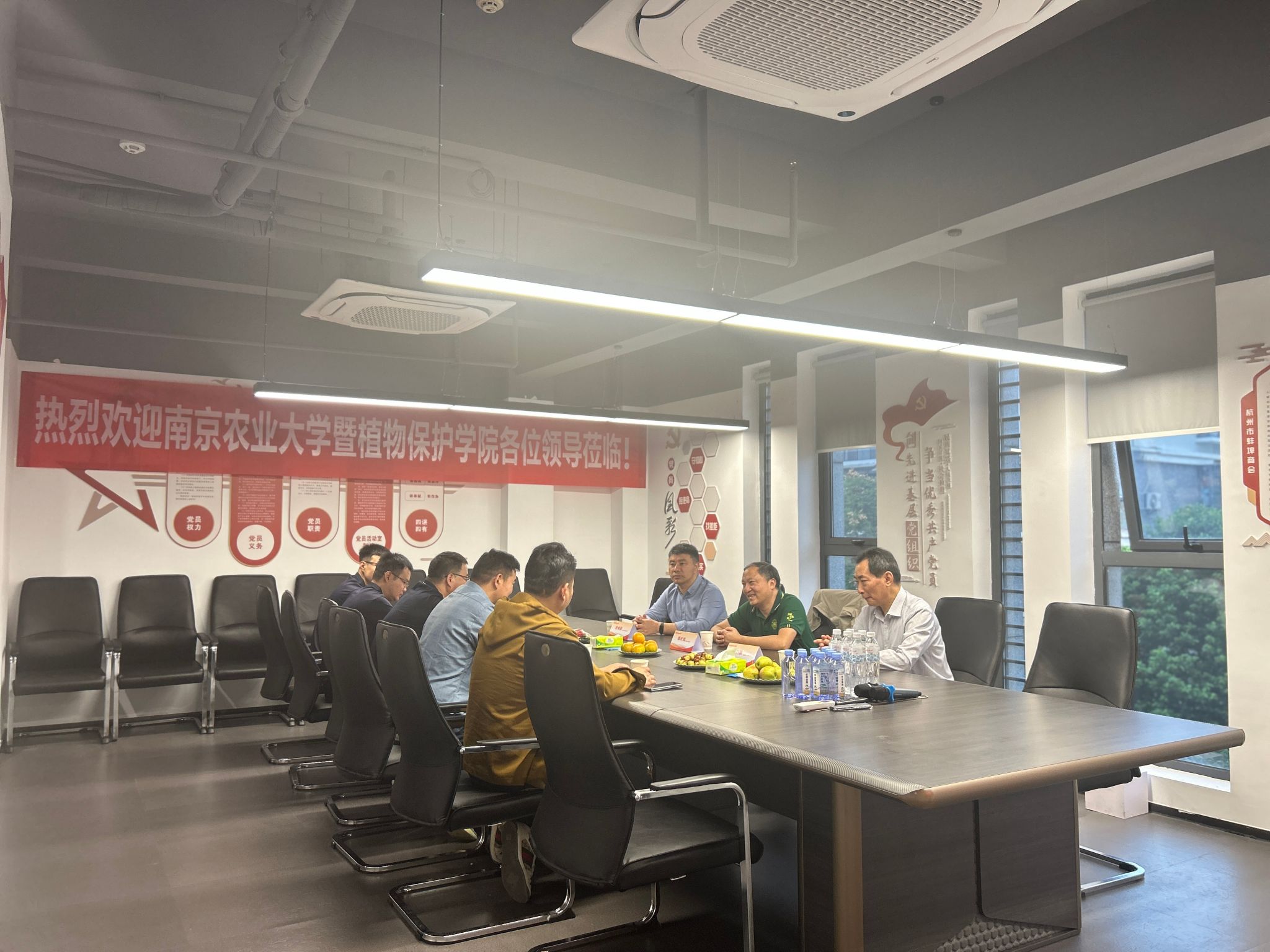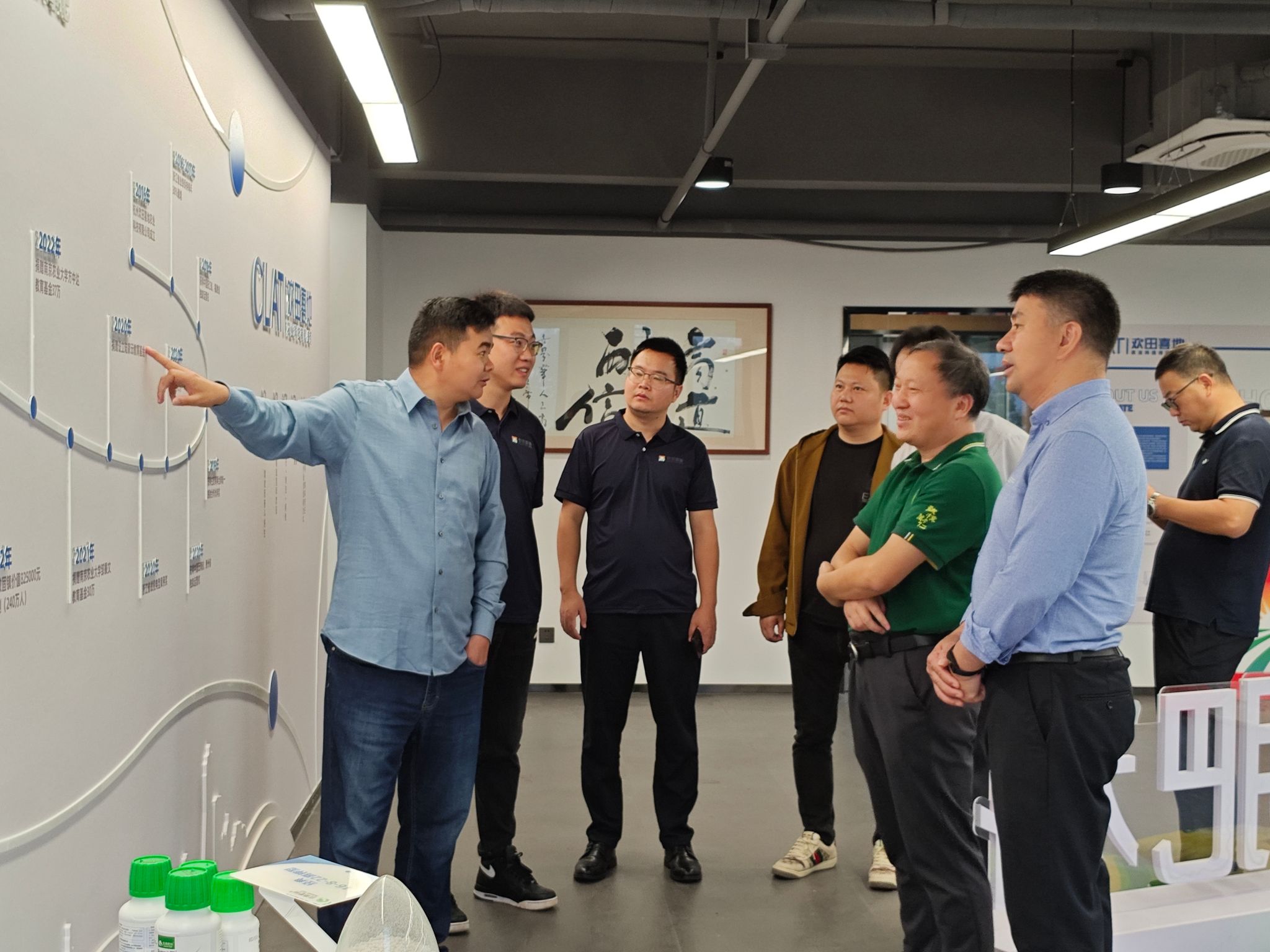 冰球官网2008届毕业生、杭州欢田喜地农业科技有限公司创始人李涛接待了张正光一行,座谈会上,他简要介绍了公司的创业历程以及公司下一步发展方向和目标,深情回忆了在南农求学期间的学习生活,再次感谢冰球突破mg正规官网的支持和老师们的倾心培养。在参观公司展厅时,他向大家详细阐述了企业形成的“简单、诚善、责任、专注、利他”的价值观,得到了大家的一致认可。