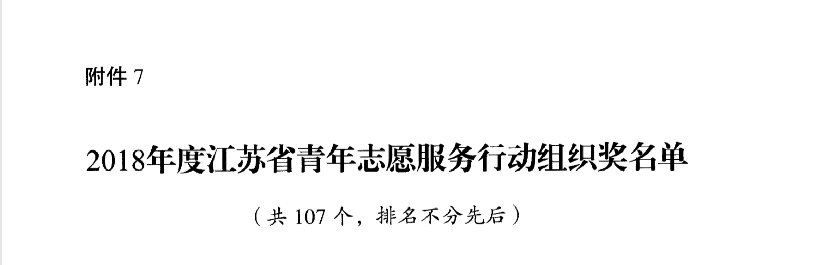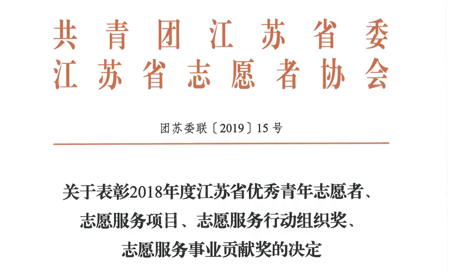 近日,经共青团江苏省委、江苏省志愿者协会评选,冰球官网荣获“2018年度江苏省青年志愿服务行动组织奖”称号。