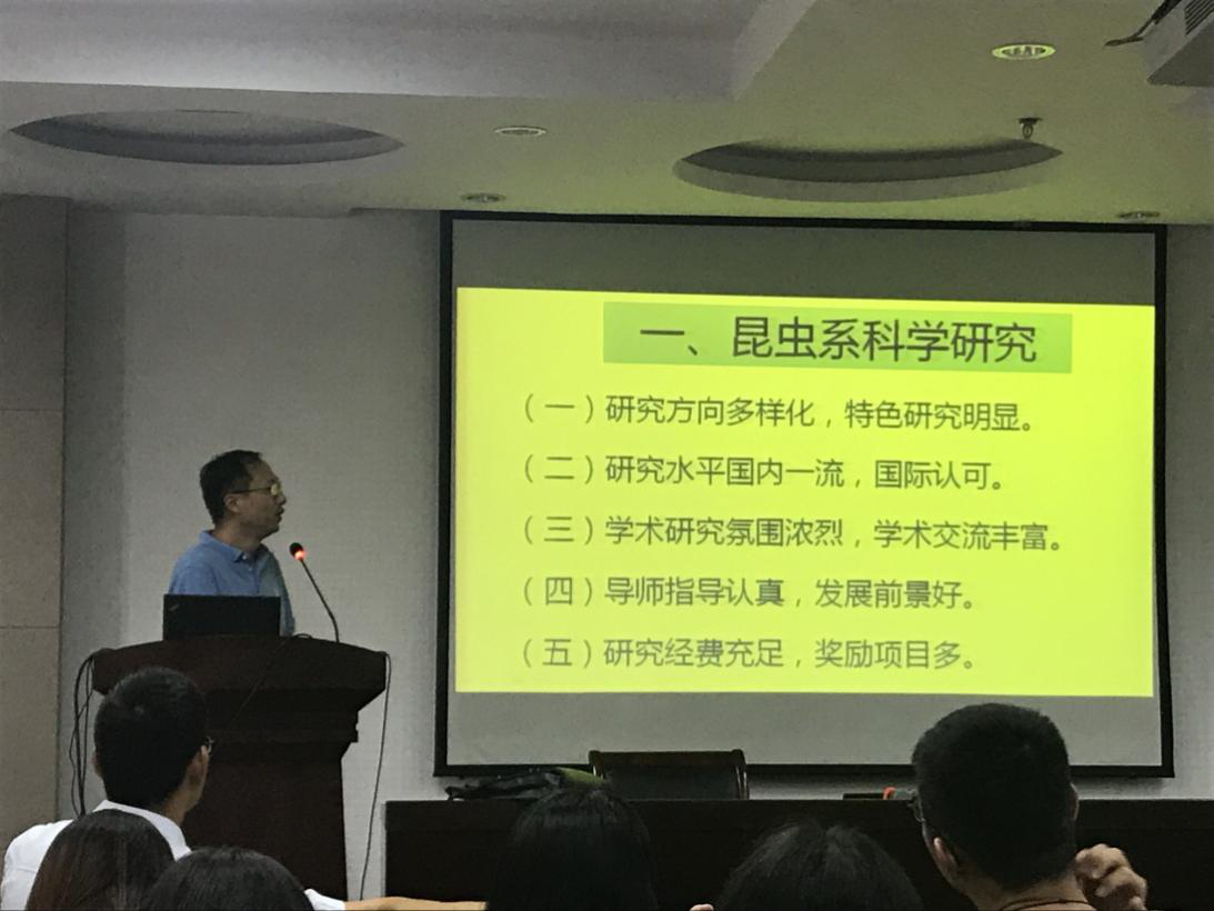 本次会议包括冰球突破mg正规官网简介、2019届深造(保研和考研)政策简介两项议程。首先由植物病理学系教授窦道龙、昆虫学系教授王备新、农药系教授高聪芬老师从不同的学科研究方向为大家进行了简单的介绍,突显出冰球突破mg正规官网悠久的发展历史、杰出的人才队伍、一流的科研平台、领先的研究方向、丰富的科研成果和人才走向,充分展示了学院实力。