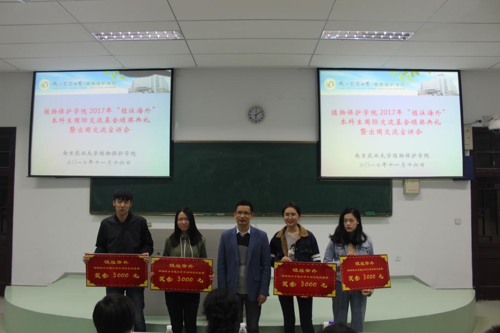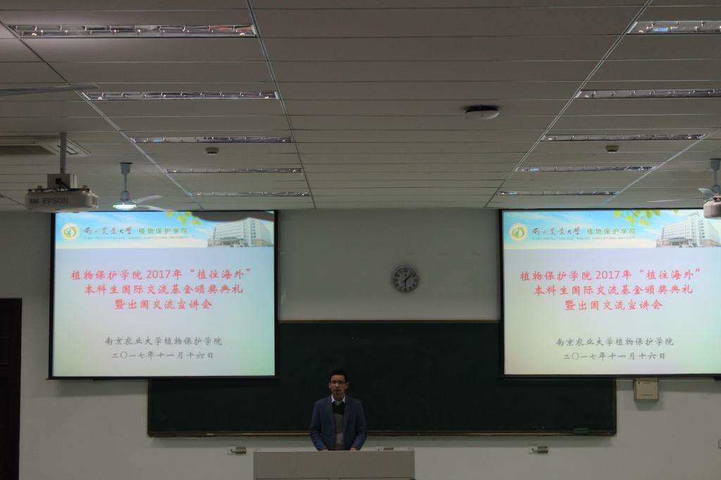 2017年11月16日,下午六点,冰球突破mg正规官网于主楼143举办2017年“植往海外”本科生国际交流基金颁奖典礼暨出国交流宣讲会。本次到场的嘉宾有国教院副院长童敏、植保院党委副书记黄绍华、植保院09年优秀校友Wonder Education校长李珂,以及植保院的辅导员和部分本科生。