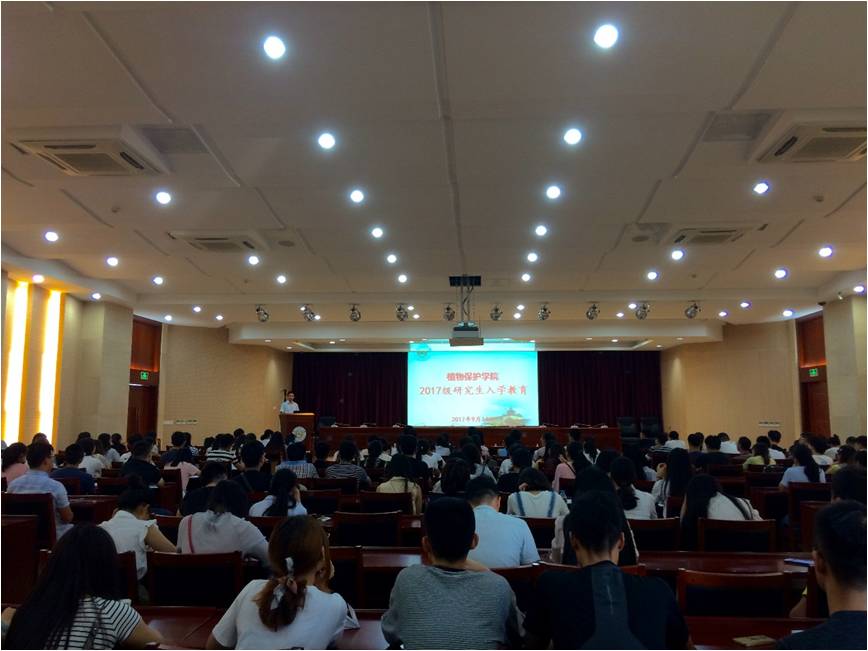 2017年9月14日上午10:00,冰球突破mg正规官网研究生新生入学教育大会在金陵研究院三楼举行。会议由院党委副书记黄绍华主持。党委书记吴益东、院长王源超、副院长叶永浩出席本次会议。出席会议的还有研究生辅导员吴智丹及教学秘书岳丽娜。植保院全体研一新生参加此次会议。