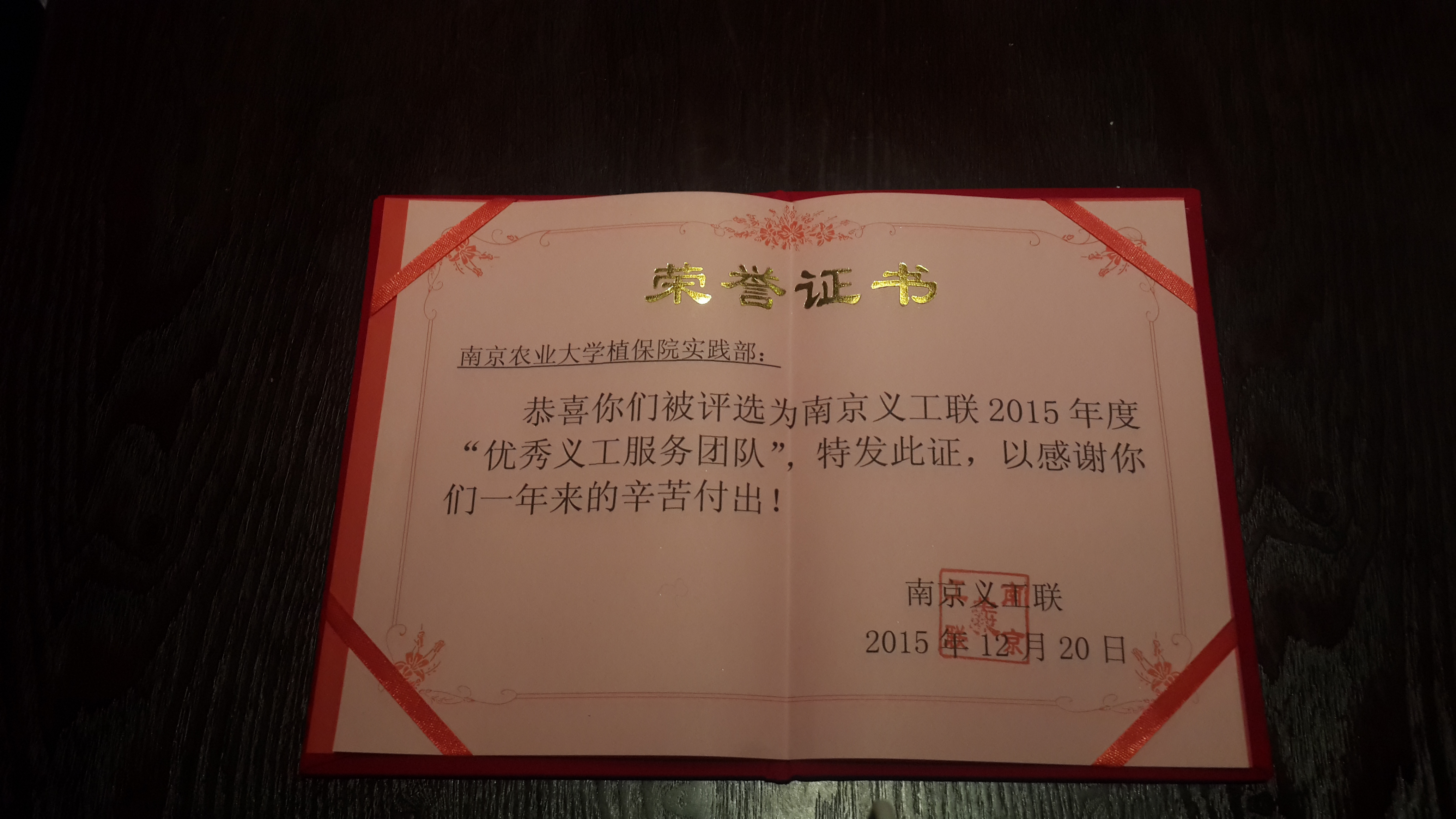 2015年12月20日,南京义工联十一周年年终会在书香世家酒店举行。冰球突破mg正规官网实践部受邀参加,获得年度优秀服务团队奖。