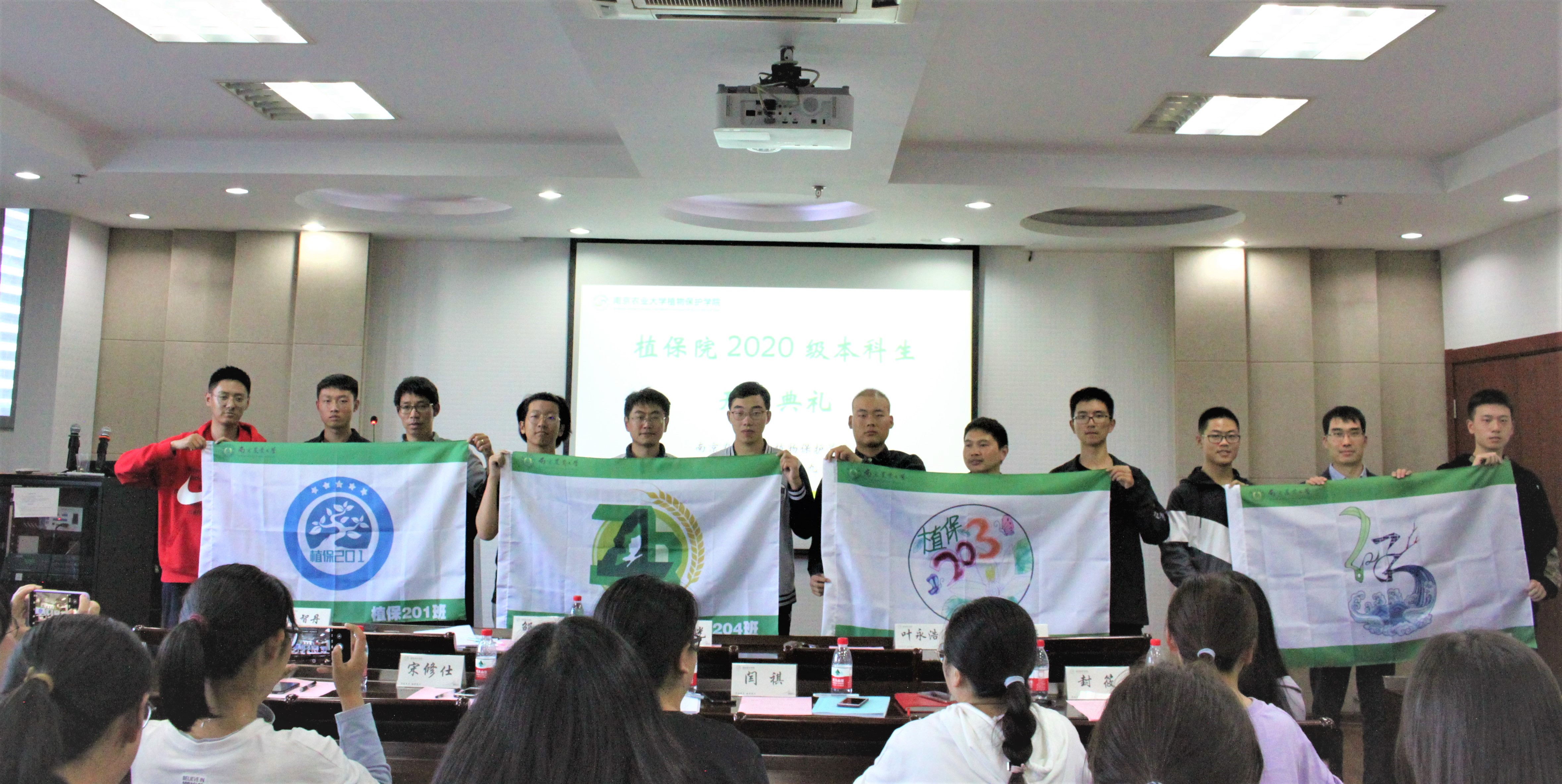2020级新生班主任张海峰、闫祺、张峰、宋修仕分别为各班级授予班旗,并为新生代表佩戴院徽。