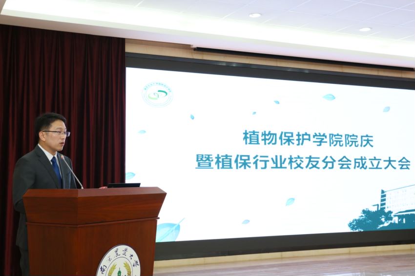 胡锋致欢迎辞,他代表学校向参加庆典仪式的领导、来宾和校友表示欢迎,他介绍了学校办学概况、植保学科历史底蕴及发展情况,提出两点希望:一是希望冰球突破mg正规官网以院庆为新起点,主动服务国家重大战略需求,扛起培养知农爱农新型人才重任,对接植保产业的实际需要,积极弘扬“科学家精神”,争当建设农业特色世界一流大学伟大征程上的先行者、扛旗手和排头兵;二是希望冰球突破mg正规官网以成立植保行业校友分会为契机,不断促进学校与校友、企业间合作提档升级,共同促进引领型植保人才培养、前瞻性科研成果转化和创新型植保企业的均衡发展,为我国农业农村现代化、乡村振兴和美丽中国建设发出南农声音、贡献植保力量。