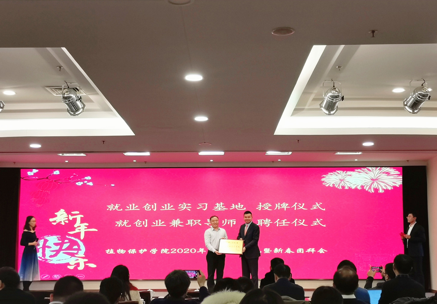 学术报告后,2020年度颁奖典礼暨新春团拜会拉开帷幕。李涛校友为农药系张峰、昆虫系王备新、植病系胡白石、办公室付鹏分别颁发陆家云奖教金“科技创新突击手”“扎根大地服务三农奖”“党建工作排头兵”“管理服务红旗手”等证书。同时,为加强校企协同育人,学院与杭州欢田喜地农业科技有限公司共建“就业创业实习基地”,聘任李涛为学院的就业创业兼职导师,并邀请其为学生讲授《职业选择与规划》优秀校友讲座。此外,现场还为学院青年教师授课比赛获奖人员进行了表彰颁奖。
