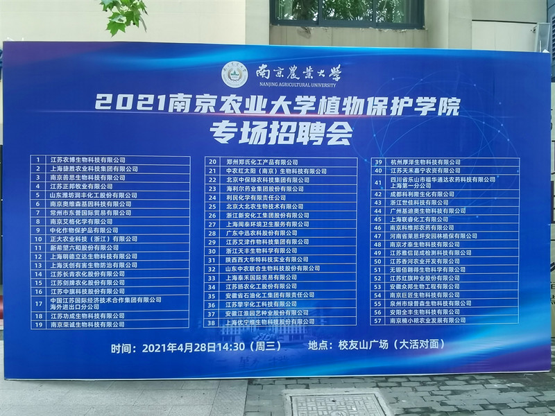 4月28日下午,冰球突破mg正规官网于校友山广场成功举办2021年专场招聘会。参与本次招聘会的有来自北京、上海、广东、江苏、浙江、山东、河北、河南等数十个省市共57家单位,提供了研发、检测、登记、外贸、销售、技术推广等多元岗位共计284个,涵盖植物保护、环境保护类、化学类、经济与贸易、生物学、外国语言文学类等十余个专业领域,为冰球突破mg正规官网及兄弟学院的毕业生展示出丰富的就业可能。