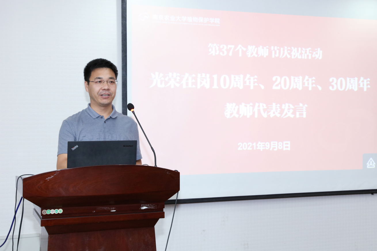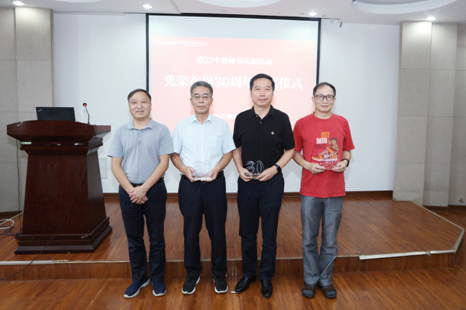 学院党委书记邵刚和院长张正光为到场的光荣在岗10周年的王欣、吴智丹、张海峰、侯毅平、郑颖、马洪雨等老师,在岗20周年的姜卫华、李保平两位老师以及在岗30周年的洪晓月、孙长海、郎志飞三位老师颁发了纪念奖杯。洪晓月、李保平、马洪雨分别作为代表分享感悟。