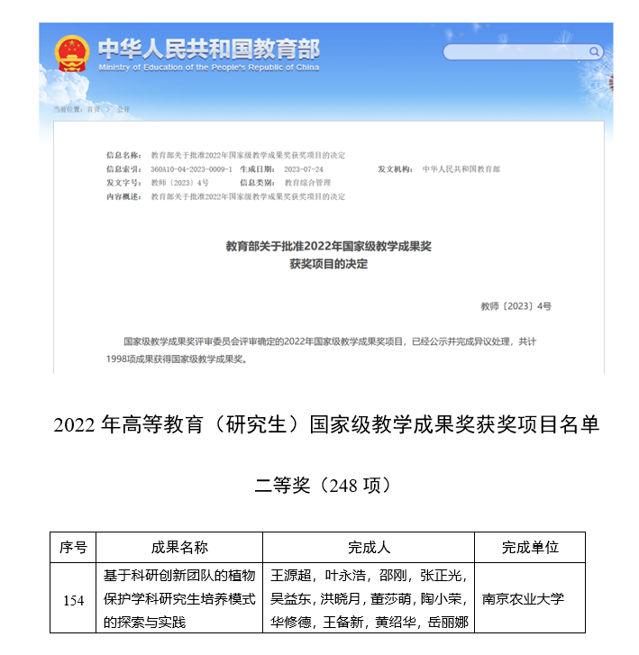近日,教育部公布了2022年国家级教学成果奖获奖项目,冰球突破mg正规官网王源超教授等申报的“基于科研创新团队的植物保护学科研究生培养模式的探索与实践”荣获2022年高等教育(研究生)国家级教学成果奖二等奖。