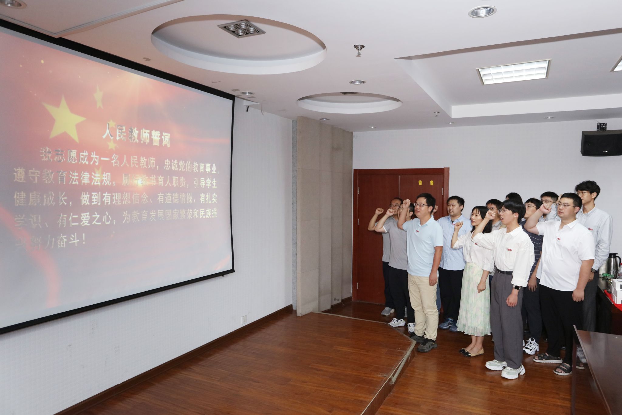 近一年新入职的青年教师依次作自我介绍,农药系董立尧教授、昆虫系吴益东教授、植病系高学文教授分别为新教师佩戴校徽。新教师进行了入职宣誓仪式,他们紧握右拳,庄严许下一名人民教师的神圣承诺!