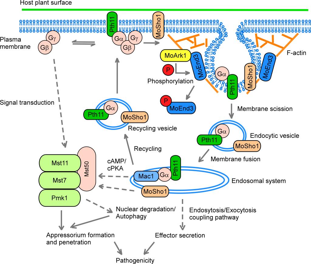 稻瘟病菌细胞膜上的跨膜受体蛋白Pth11和Sho1识别水稻表面信号(如蜡质、硬度与疏水性),产生侵染水稻必需的附着胞,但是Pth11和Sho1识别表面信号后的传导机制仍不清楚。张正光研究组前期发现稻瘟病菌的肌动蛋白调控激酶MoArk1控制内吞,将细胞膜上的蛋白转运至胞内。该研究发现与MoArk1互作的蛋白MoEnd3控制内吞。Pth11和MoSho1识别表面信号后,MoEnd3介导的内吞将这两个膜蛋白运输至内涵体,进而将信号传递给MAPK激酶—Pmk1激酶级联信号途径,调控附着胞的形成和致病力。进一步研究发现激酶MoArk1对MoEnd3蛋白的第222位丝氨酸进行磷酸化修饰,负调控MoEnd3的生物学功能。同时发现MoEnd3调控无毒效应子的分子。该研究解析了稻瘟病菌通过内吞将识别寄主表面信号的膜蛋白运输至胞内,进而产生附着胞的分子机制,拓展了人们对植物病原真菌附着胞形成机制的认识,同时对防治稻瘟病新型药剂的开发具有重要参考价值。