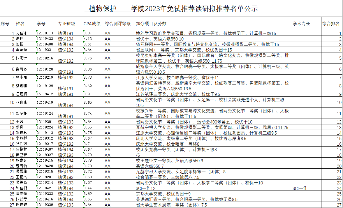 根据《冰球突破mg正规官网关于做好2023年推荐优秀应届本科毕业生免试攻读研究生推荐工作的通知》文件精神,经学生自愿申请,学院初步审核以及资格认定答辩,依据《冰球突破mg正规官网2023年推荐免试研究生(含“直博生”)工作方案》综合排名,现将最终拟推荐名单公示如下(按综合成绩排名排序):